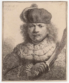 Rembrandt van Rijn, Self-Portrait with Raised Saber, 1634, etching, with touches of burin (state II of II), retouched by a later hand with brush and gray ink, image: 4 13/16 x 4 in., sheet: 4⅞ x 4 in. Fondation Custodia, Collection Frits Lugt, Paris (artwork in the public domain)