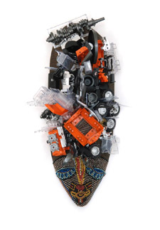 Torkwase Dyson, Untitled (West African mask, V-8 Model engine, and bling t-shirt), 2008, mixed media, plastic, wood, bullet heads, and cotton, 24 x 8 x 13 in. (artwork © Torkwase Dyson; photograph provided by Flanders Art Gallery)