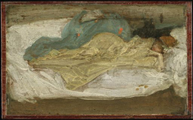 James Abbott McNeill Whistler, The Little White Sofa, ca. 1883–84, oil on wood panel, 4½ x 7 3/16 in.; framed: 4⅛ x 5 3/16 x 11/16 in. Harvard Art Museums/Fogg Museum, Bequest of Grenville L. Winthrop, 1943.169 (artwork in the public domain)