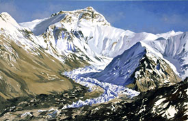 Diane Burko, #2, Main Rongbuk Glacier, Tibet, 2007, after David Breashears, 2010, oil on canvas, 48 x 74 in. (artwork © Diane Burko)