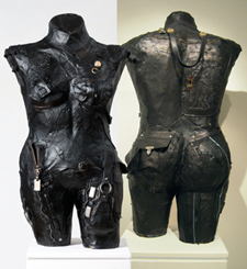 Linda Stein, Defender 696 (with rear view), 2010, leather, metal, mixed media, 38 x 22 x 14 in. (artwork © Linda Stein)