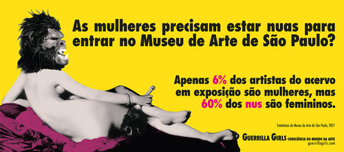 In one of the new works on display at MASP, the Guerrilla Girls update their famous Do Women Have To Be Naked… poster, this time addressing São Paulo’s Museum of Art (where 60% of the nudes are women, but only 6% of the artists are). The catalog for the exhibition does the important work of translating the Guerrilla Girls’ mostly text-based work into Portuguese. The exhibition is curated by Adriano Pedrosa, artistic director of MASP, and Camila Bechelany, curator of Latin American Art.