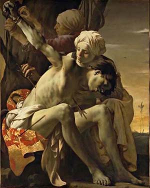 Hendrick ter Brugghen, Saint Sebastian Tended by Irene, 1625, oil on canvas, 58 11/16 x 47 in. (149.1 x 119.4 cm). Allen Memorial Art Museum, Oberlin College. R. T. Miller Jr. Fund, 1953.256 (artwork in the public domain)