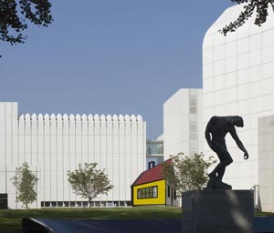 Sculptures by Roy Lichtenstein and August Rodin in front of the High Museum of Art’s Anne Cox Chambers Wing (left), Wieland Pavilion (back right), and main building (front right) (photograph © 2005 Jonathan Jillyer and provided by the High Museum of Art)