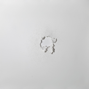 Christopher McNulty, 20,249 Days, 2007, dart holes in paper, 42 x 42 in. (artwork © Christopher McNulty)