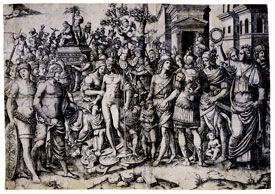 Marcantonio Raimondi, Triumph of Scipio (?), ca. 1509–10, engraving on white paper, state i of i, 13 7/16 x 19 7/16 in. (sheet); 21⅝ x 27⅜ in. (frame). Georgia Museum of Art, University of Georgia; extended loan from the collection of Giuliano Ceseri. GMOA 1995.831E (artwork in the public domain)