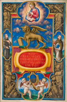 Master T.° Ve., illuminated frontispiece of the commissione of Doge Francesco Donato to Vincenzo Gritti as Lieutenant of Udine, 1546. paint and gold paint on vellum, 24 x 17 cm. (artwork in the public domain)
