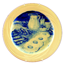 Julie Green, Texas 15 June 2010 Four eggs, four chicken drumsticks, salsa, four jalapeno peppers, lettuce, tortillas, hashbrowns, garlic bread, two pork chops, white and yellow grated cheese, sliced onions and tomatoes, a pitcher of milk and a vanilla shake, 2011, cobalt blue mineral paint kiln fired on 12-inch ceramic plate (artwork © Julie Green)