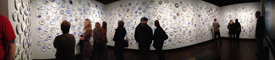 Julie Green, installation view of The Last Supper: 500 Plates, 2000–13 (ongoing), cobalt blue on kiln-fired ceramics, 8 x 35 ft. (artwork © Julie Green; photograph by Richard Herskowitz)