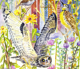 Michelle Kogan, detail of Wildlife Comes to Lake Shore Drive, 2013, watercolor and watercolor pencil on paper, 40 x 26 in. (artwork © Michelle Kogan)
