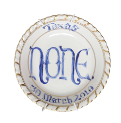 Julie Green, Texas 30 March 2010, from The Last Supper series (2000–ongoing), cobalt blue pigment painted on porcelain, kiln-fired ceramic, 6 x 6 x 1 in. (artwork © Julie Green)