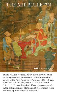 The cover of the September 2016 issue of The Art Bulletin depicts Buddhist monks evoking ghosts in a nocturnal ceremony; the large detail from a polychrome silk scroll accompanies Phillip E. Bloom’s essay on twelfth-century Chinese paintings of Buddhist rituals. In other essays featured in the September issue, Judy Sund reconsiders nineteenth-century perceptions of Watteau’s Pierrot character as forlorn, Christine I. Ho contextualizes a brush-and-ink painting created by a collective in the early People’s Republic of China, and James Nisbet surveys intersections of global politics and imaging in the site-specific art of Walter De Maria. In his “Whither Art History?” essay, Bárbaro Martínez-Ruiz explores Kongo visual and cultural practices in contemporary art.