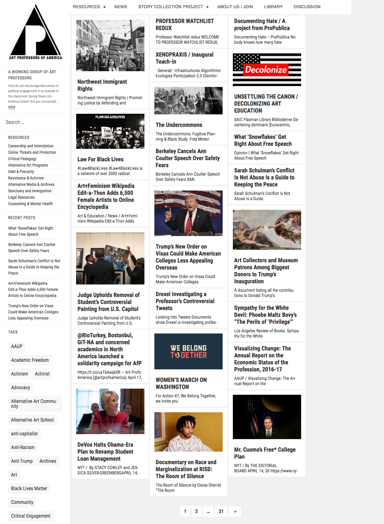 A couple of dozen art professors from several schools in the Northeast came together in the wake of the election initially to discuss how we might respond to a right-wing campaign to blacklist liberal and progressive faculty by smearing them as un-American. Simultaneously, many of us were seeing a troubling uptick both of threats and attacks on Latino, Muslim, and LGBTQ students, and of anti-Semitism on campuses. Some of us were also experiencing increased feelings of anxiety and self-censorship. Most of all, we felt the urgency and need of being together and sharing our experiences as artists and educators and citizens. We decided to meet every two weeks in New York and continue the conversation. Because colleagues from around the country reached out to be part of the dialogue, we started an email group that now represents professors in well over a dozen states. We are currently working on expanding this network to all fifty states, welcoming art professors of all ranks and teaching status, including TAs and those between positions. Our primary goal right now is to be a platform that connects people nationally and shares critical information. Our latest project was the launch of our website that features news related to education in our political climate and a critical resource page.