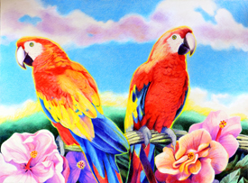 Kyra Belán, Two Macaws in Paradise, colored pencil on paper (artwork © Kyra Belán)