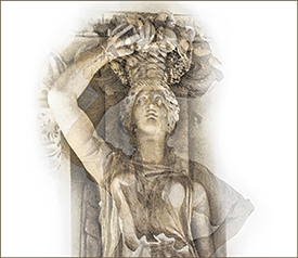 Virginia Maksymowicz, on the left, Comparisons, 2015, inkjet prints, 22 x 17 in. each; on the right, Caryatid, 2015, inkjet print, Hydro-Stone, fiberglass, and resin, 84 x 60 x 36 in. (artwork © Virginia Maksymowicz; photograph by Blaise Tobia)