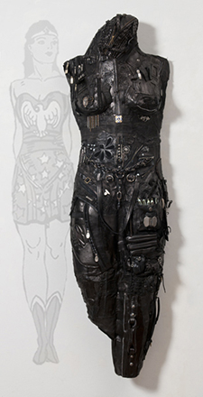 Linda Stein, Protector 841 with Wonder Woman Shadow, 2014, leather, metal, and mixed media, 78 x 24 x 8 in. (protector only) (artwork © Linda Stein)