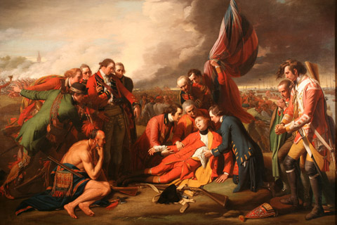 Benjamin West, The Death of General Wolfe, 1770, oil on canvas, 60 x 84½ in. (152.6 x 214.5 cm). National Gallery of Canada, Ottawa. Transfer from the Canadian War Memorials, 1921 (Gift of the 2nd Duke of Westminster, England, 1918). National Gallery of Canada (no. 8007) (artwork in the public domain)